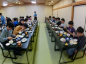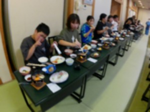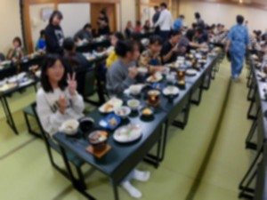 牛肉の陶板焼、お刺身、エビフライ、からあげなどの豪華な食事です。みんなよく食べています。