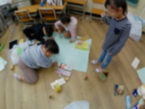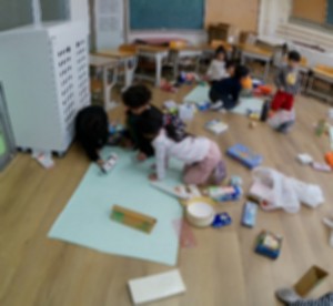 1年生算数「箱や、円柱、三角柱を使って、人や、家、乗り物を書きました」
