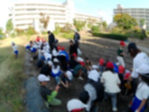 2年生「さつまいもを収穫しました。職場体験の中学生にもお手伝いしてもらいました」