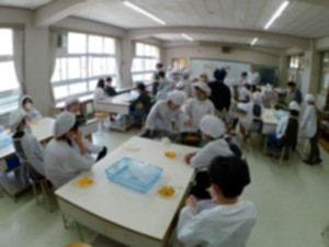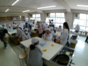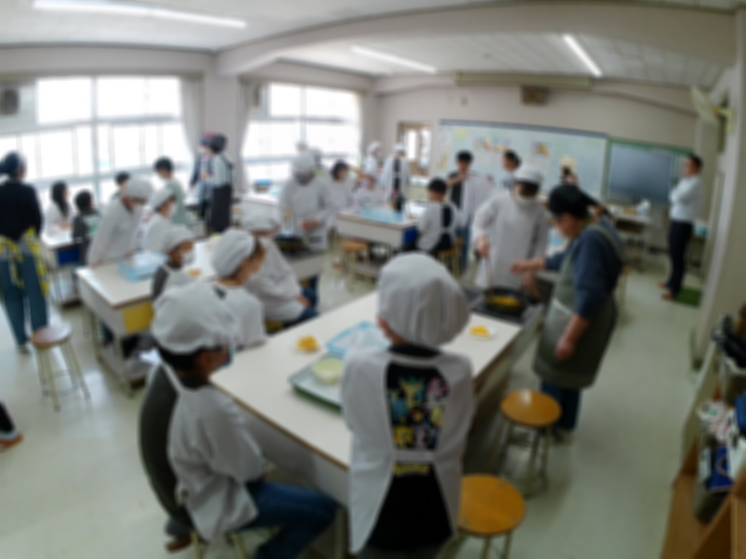 6年生家庭科「調理実習で、スクランブルエッグを作りました。民生委員の方々が、お手伝いに来てくださいました。ありがとうございます」