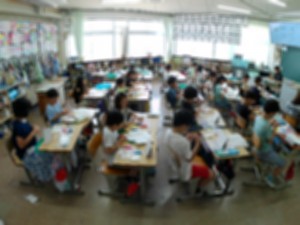 2年生図工「ペアのおともだちと聴き合いながら、ねんどに色をつけています」