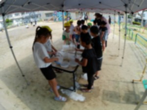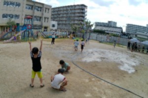 幼稚園に1年生が来て、一緒に水遊びを楽しみました。