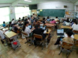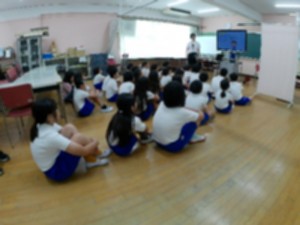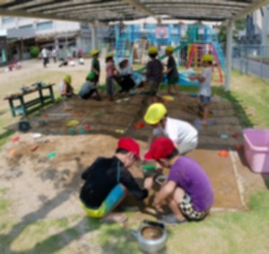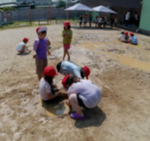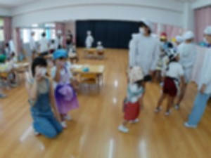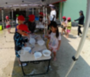幼稚園に1年生が来て、一緒に水遊びを楽しみました。