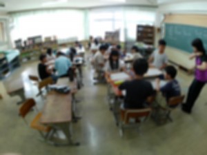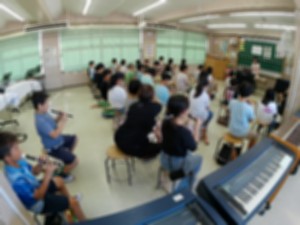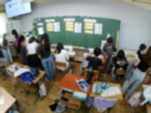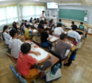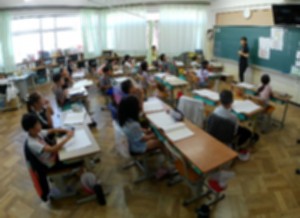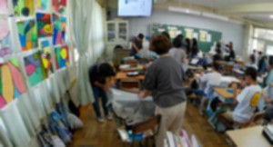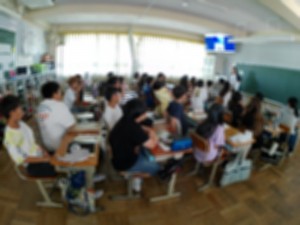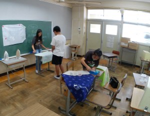 6年生家庭科「エプロンの製作をしています。民生委員の方がお手伝いに来てくださいました。ありがとうございます。」