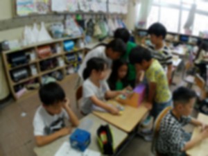 3年生「夏休みに製作した貯金箱(友だちの作品)を見せてもらい、感じたことを聴き合いました。」