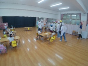 幼稚園の給食交流に、6年生がお手伝いをしてくれました。