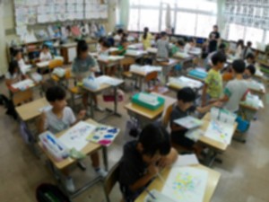 3年生図工「ストローで絵の具を画用紙に吹き付けて、描いています」