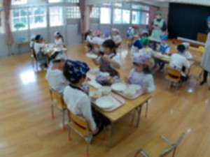 幼稚園が4年生に手伝ってもらって、給食を食べました。